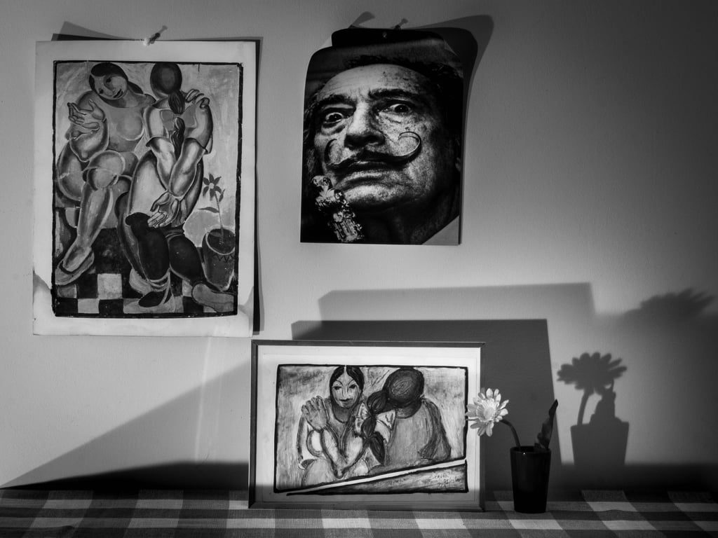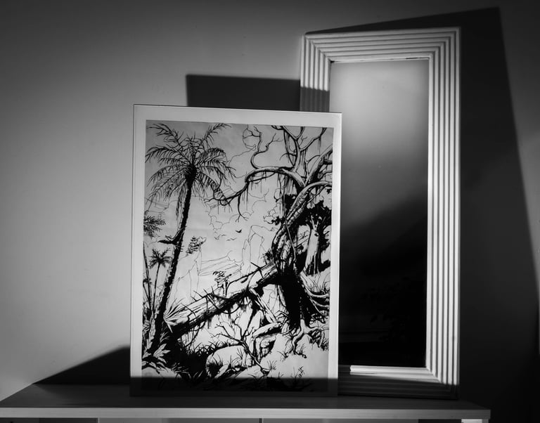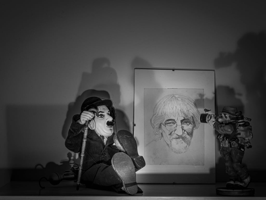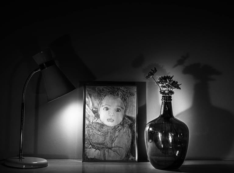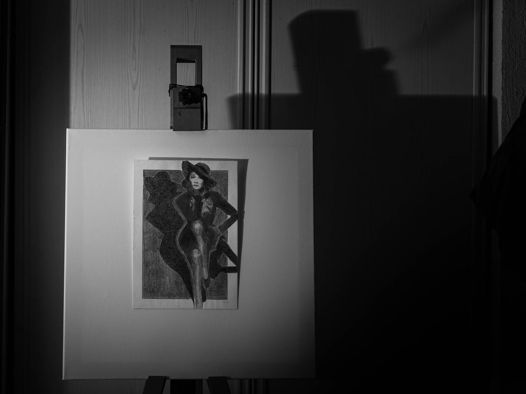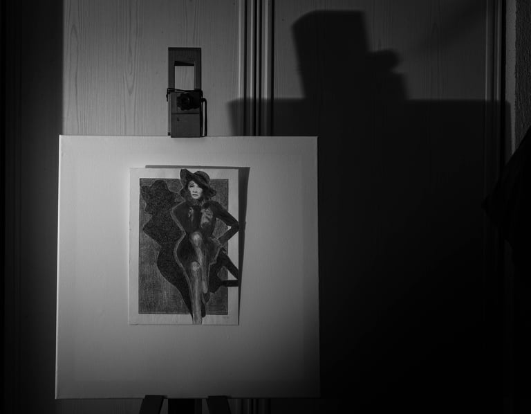 Mes 1er travaux photographiques entrepris lors du confinement COVID de 2020 : la mise en scène de mes dessins en noir & blanc dans une ambiance ombres et lumières.