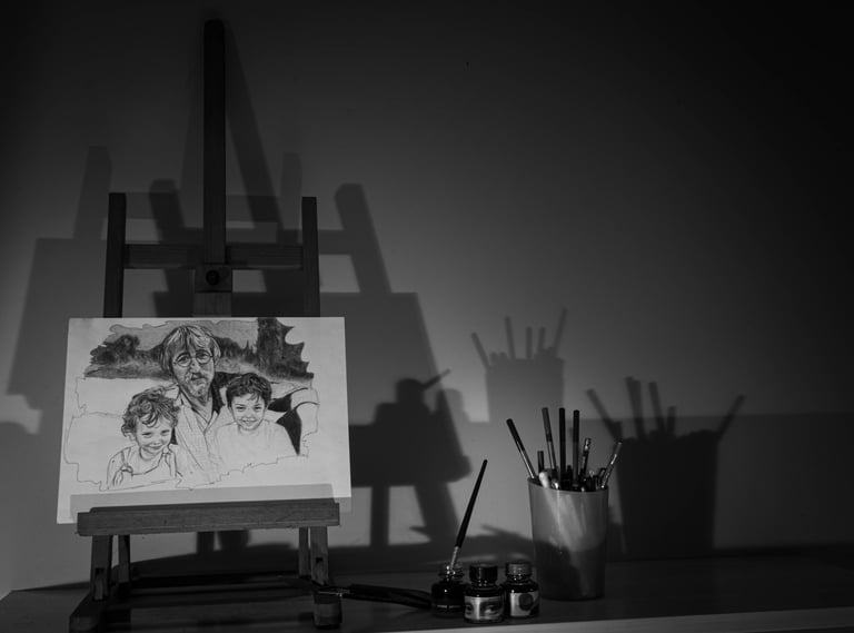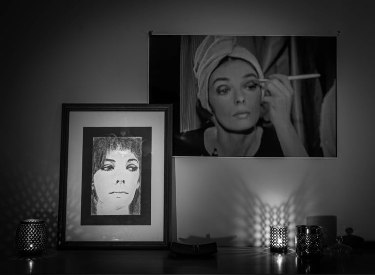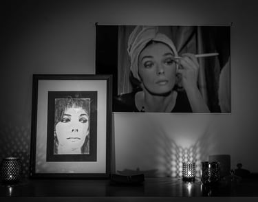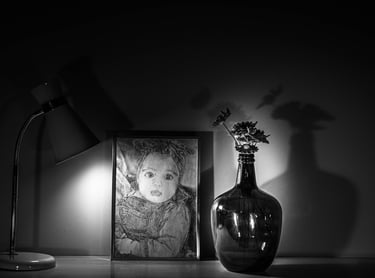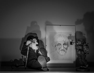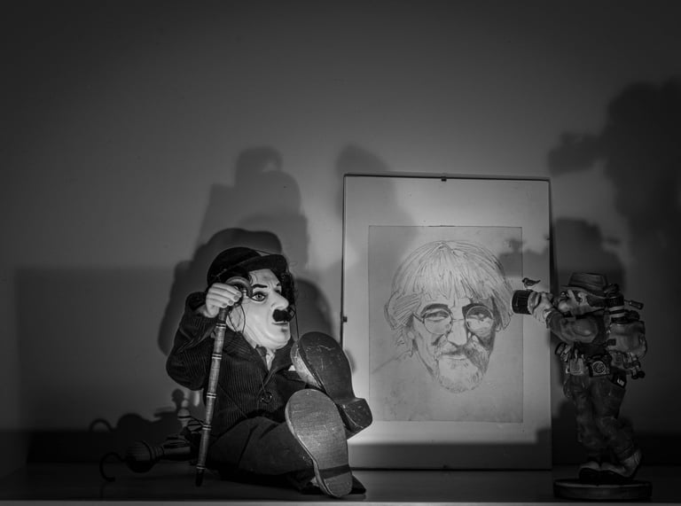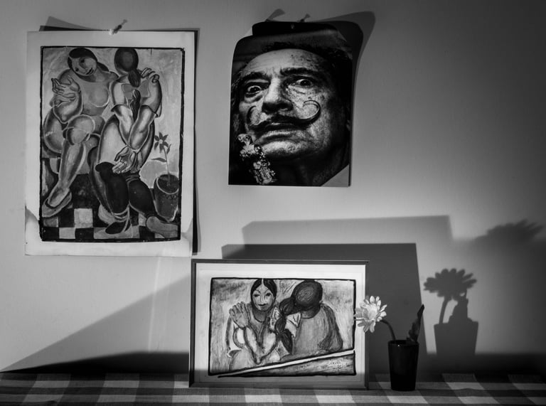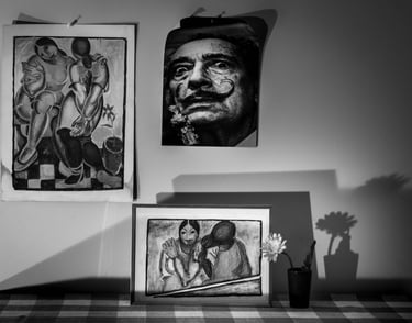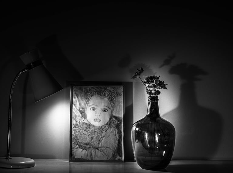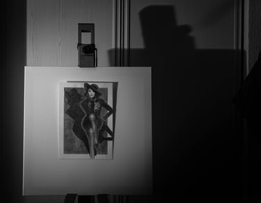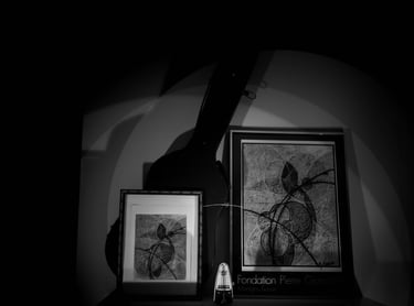 Mes 1er travaux photographiques entrepris lors du confinement COVID de 2020 : la mise en scène de mes dessins en noir & blanc dans une ambiance ombres et lumières.